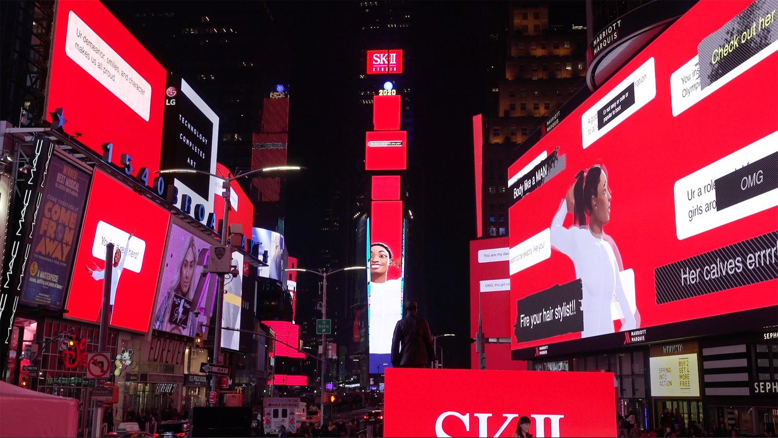 A centerpiece of the campaign was the animated short film “VS Trolls,” where Biles confronts a monstrous embodiment of online negativity. This film was prominently displayed across 40+ digital billboards in Times Square, creating a striking visual statement. The campaign’s launch included a live event with Biles and journalist Katie Couric, further emphasizing the message that beauty should not be a competition.